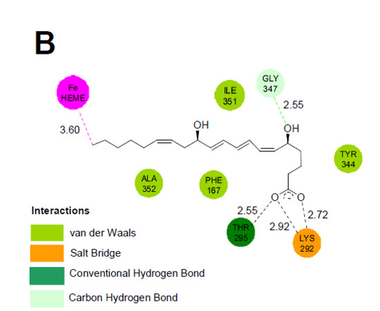 In order to better understand the origin of the regioselectivity of the CYP2U1-catalyzed hydroxylation of LTB4, we performed molecular docking experiments with CDOCKER [22] using our truncated 3D model of CYP2U1 [10,23]. All poses where LTB4 was located outside the active site and those placing its carboxylate or OH functions that are potential iron ligands near the iron of the heme were discarded. Among the 1760 poses obtained with CDOCKER energies between −80 and −48 kcal/mol, a cluster of 60 poses showed the C20-atom of the alkyl chain positioned close to the iron of the heme (Figure 3). The molecule was inserted at the level of the active site so as to place the C20-atom at a distance of 3.6 Å from the heme iron, with the C20-Fe segment almost perpendicular to the heme. LTB4 was in an extended conformation, folded around helix I and close to helices G and I. In all these poses, the charged carboxyl group of LTB4 interacted with Lys 292 and Thr 295 at the entrance of channel 2ac (following the nomenclature of Cojocaru et al. [24,25], distances between the Lys Nε-atom and the OH-Thr group and an O-atom of LTB4-carboxylate of about 2.9, 2.7 and 2.5 Å, respectively) (Figure 3). The alkyl chain of LTB4 established hydrophobic interactions with hydrophobic residues of Phe 167 (π-staking with the diene-moiety), Tyr 344, Ala 352, Leu 530 and Ile 351, all along channel 2ac. Interestingly, the O-atom carried by the C5-atom interacted with one of the H-atoms of Gly 347 (distance 2.55 Å). By contrast, no clear interaction could be observed between the OH-group at C12 of LTB4 and a residue of the protein. The positioning of LTB4 in our model thus displays similarities with that observed for AA [10,23] except for new interactions linked to the insertion of the C5-OH group. This could explain the low Km values measured for the two compounds.
