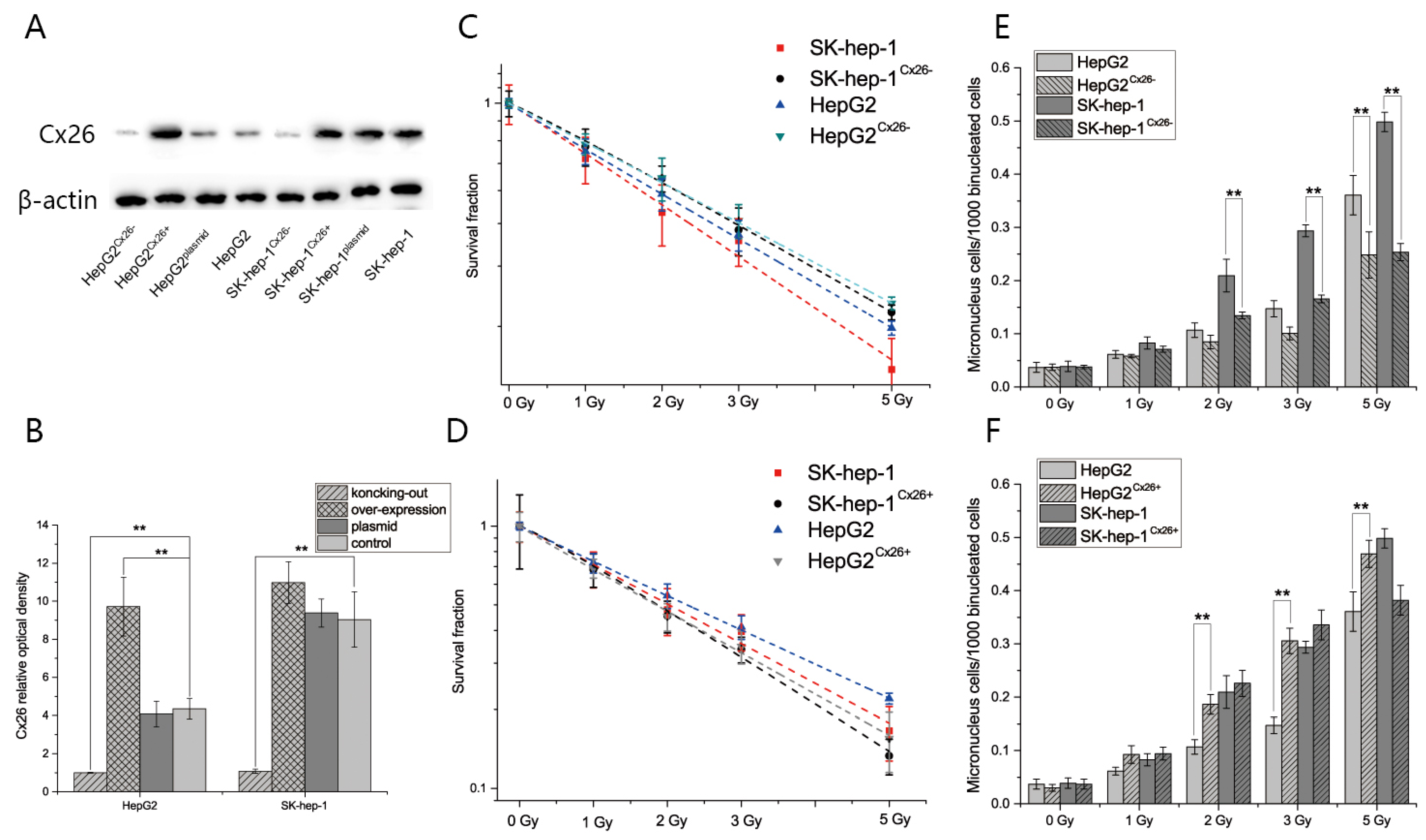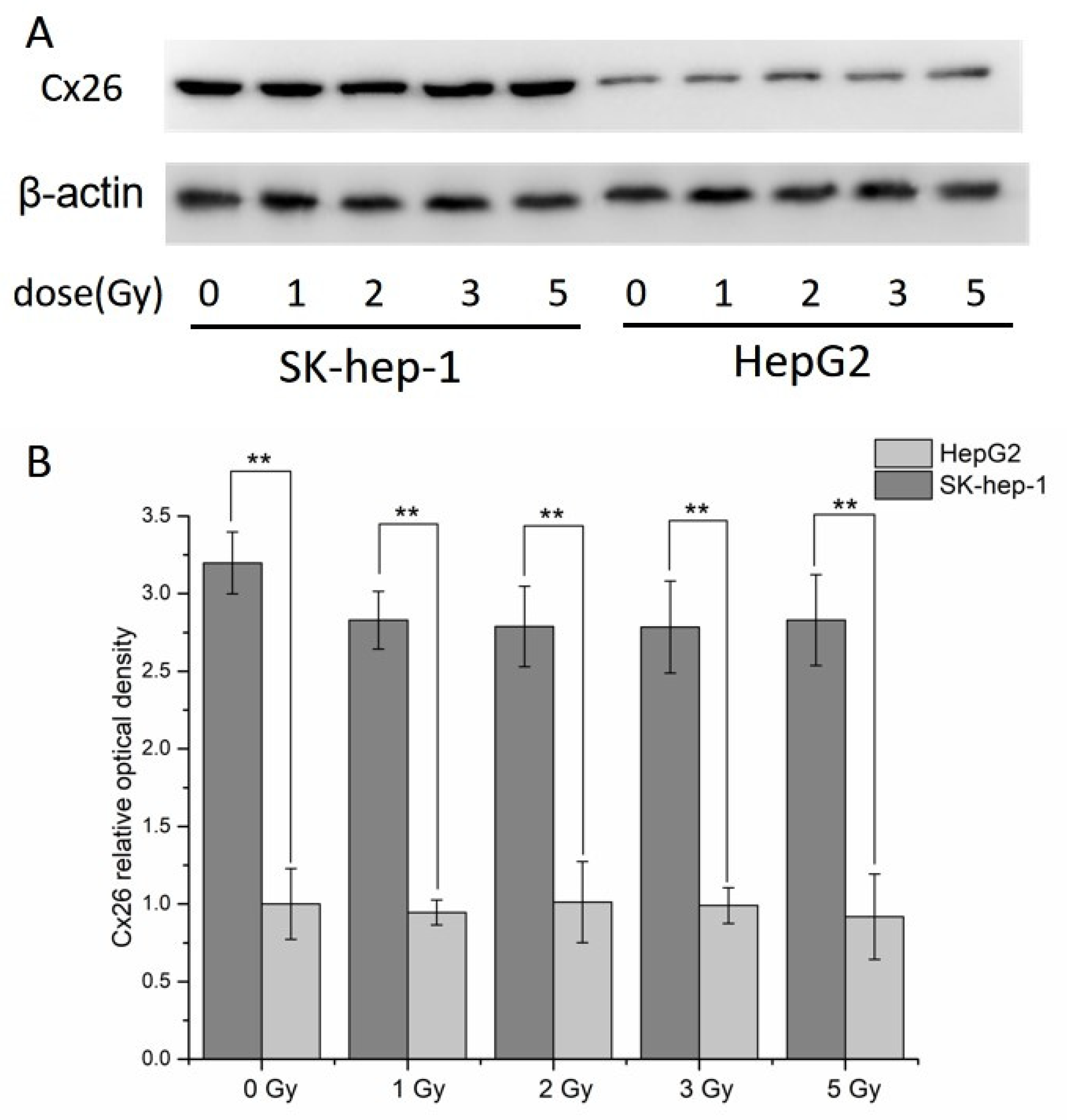2.5. Expression of Cx26 Affects the Radiosensitivity of HepG2 and SK-hep-1 Cells