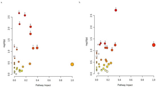 | S/N | Pathway Name | −log(p) | Metabolites Expressed in Regulated Pathways |
