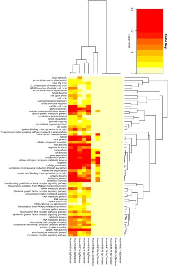 Heatmap of GO terms of the mRNA targets of 12 miRNAs. Heatmap showing which GO terms are associated with each miRNA and the colors associated with the p value for the miRNA/GO term pair.