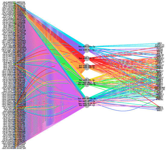 To assess the ability of upregulated circRNAs to sequester specific miRNAs resulting in derepression of miRNA-targeted mRNAs, correlations among the three types of molecules were analyzed. mRNA targets of the miRNAs utilized in the GO analysis were evaluated for differential expression and log2(fold change) status. There were 37 genes found to be both miRNA targets and DE, suggesting perturbed mRNA expression in ALS as a result of increased miRNA sequestering by upregulated circRNAs in ALS. This analysis revealed a circRNA–miRNA–mRNA interaction network involved in ALS (Figure 2).