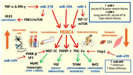 Muscle miRNAs regulate muscle oxidative/slow twitch phenotype and mass. HDAC4 is upregulated in pro-atrophic conditions [58,59,60], inhibiting the expression of MEF-2C and PGC-1α [116,117]. This is associated with decreased transcription of muscle-contractile, mitochondrial and antioxidant proteins. HDAC4 also suppresses the expression of FGFBP-1, reducing the binding and activation of neurogenic FGFs [62]. miR-206 is upregulated following acute high-intensity exercise [47], contributing to increased muscle innervation. HDAC4 is targeted by miR-378, which promotes autophagy by releasing PDK1/mTOR-dependent suppression of autophagy-inducing ULK1 [109,112]. miR-378 levels are diminished by pro-inflammatory cytokines, TNF-α and IFN-γ [109]. HDAC4 nuclear abundance/activity decreases in response to endurance exercise [57] and in differentiating muscle progenitors [112]. miR-1 blocks HDAC4 expression and is elevated in slow-twitch relative to fast-twitch fibres. miR-1 is increased following acute endurance training (ET) compared to long-term (ET) and decreased after acute hypertrophy training [47]. Thus, ET may acutely promote miRNA profile permissive to the enhancement of oxidative phenotype while maintaining muscle protein synthesis and proliferative potential long-term. miR-499 opposes the effects of HDAC4 and strongly correlates with aerobic and metabolic capacity [121]. Red arrow—inhibition; green arrow—upregulation.