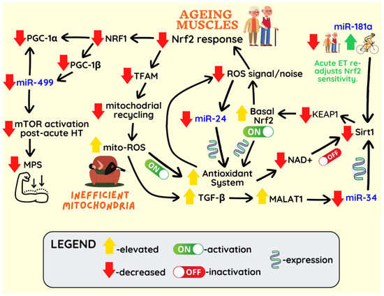 Several studies reported that miR-34a, miR-93, and miR-144 targeting Nrf2 are upregulated in various tissues in aged rodents [149,150,151]. Notably, Nrf2 disrupted activation has been strongly linked to the induction of cellular senescence [152]. Recently, the expression of long non-coding RNA, MALAT1, acting as a sponge (negative regulator) for miR-34a was shown to decrease in ageing muscle cells [153]. The downregulation of MALAT1 and consequently increased miR-34a availability were shown to be ROS-dependent and resulted in the induction of the major pro-inflammatory cytokine, transforming growth factor-β1 (TGF-β1) [153]. miR-34a suppresses Sirt1 [154], which in turn is involved in PGC-1α activation and Nrf2 de-repression [23]. Sirt1 is also targeted by miR-181a, which is significantly downregulated in the skeletal muscles of old mice, likely representing a failed compensatory mechanism owing to disturbed miRNA-target interaction [155]. This impairment of target binding might be due to increased RNA oxidative damage seen with ageing and metabolic disease [156,157]. Conversely, the position-specific oxidation of miRNAs can also be conducive to maladaptive post-transcriptional modulation, as observed in cardiac hypertrophy [158].