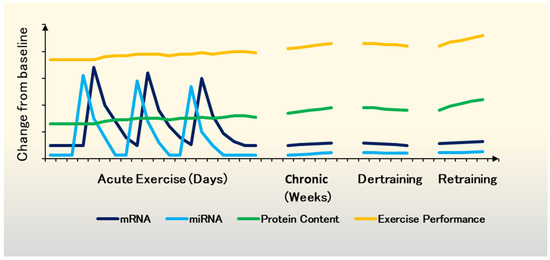 A revised model of the molecular basis of adaptation to exercise. Changes in mRNA expression (dark blue), miRNA (light blue) and protein content (green) due to acute and chronic exercise. Individual bouts of exercise are necessary for adaptation but insufficient to significantly alter the phenotype. Rapid bursts of mRNA during post-exercise recovery facilitate the expression of target genes. Alterations in mRNA expression several-fold from basal levels are typically greatest at 3–12 h after exercise and generally return to basal levels within 24 h. miRNA response follows a similar burst-like trajectory and miRNAs are thought to respond to changes in the environment quickly. The translational response is modest in comparison to mRNA and miRNAs. However, superimposing exercise bouts chronically results in the gradual accumulation of protein content contributing to enhanced exercise performance (orange). During a period of detraining, the baseline mRNA, miRNA and protein levels decrease steadily, but epigenetic changes decelerate the phenotypic decline. Initially, exercise performance does not suffer due to reduced residual fatigue (i.e., tapering). Upon return to training, people with longer exercise history achieve their previous phenotype at a faster rate than in the past or less trained individuals. This effect is likely due to the miRNA-dependent establishment or enhancement of the pro-adaptive epigenetic profile (model revised based on [39,163].