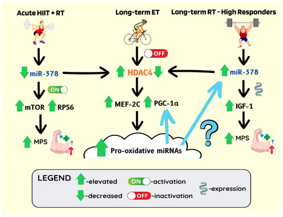 Long-term endurance training-induced miRNA cloud may facilitate oxidative and hypertrophic sensitivity (exercise memory). miR-378 is significantly higher in high responders compared to low responders following 12 weeks of hypertrophy training. Anabolic responsiveness correlates with increased IGF-1 expression. ET-induced AMPK and CaMK signalling reduces HDAC nuclear abundance. Correspondingly, miR-378 downregulates HDAC4 expression. Decreased HDAC4 epigenetic activity is permissive to the expression of muscle-specific, antioxidant, mitochondrial, and pro-oxidative miRNAs genes. The pro-oxidative miRNAs may establish a positive feedback loop maintaining the expression of the slow twitch/oxidative muscle genes and potentially be responsible for increased responsiveness/sensitivity to hypertrophic stimuli. The acute RT-dependent downregulation of miR-378 and subsequent increase in HDAC4 activity allows mounting of regenerative/inflammatory response. However, lifelong, regular aerobic training is needed to control HDAC4 activity and optimise its regulatory effects on muscle plasticity and homeostasis.