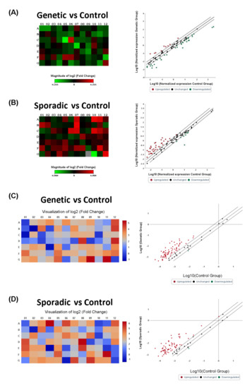 In particular, a generalized downregulation was observed in the serum miRNAs expression from genetic FTD patients when compared to the controls, whereas an overall upregulation was observed for patients with sporadic FTD versus the controls (Figure 1A,B, Supplementary Tables S1 and S2).