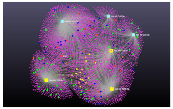 Network visualization for the enrichment analysis of miR-155-5p, miR-15a-5p, miR124-3p, miR-222-3p, miR-140-3p, and miR-106b-5p in GRN and C9ORF72 FTD group. Yellow squares represent miRNAs, and pink circles are their targets. In particular, yellow circles represent the shared interactions. Phagosome and regulation of autophagy target genes are represented in red, axon guidance pathway in blue, and RNA degradation and transport are highlighted in green.