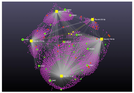 Network visualization for the enrichment analysis of miR-223-3p, miR-15a-5p, miR-222-3p, and miR-16-5p in GRN and MAPT FTD group. Yellow squares represent miRNAs, and pink circles are their targets. In particular, yellow circles represent the shared interactions between miR-155-5p, miR-106b-5p, and miR-15a-5p. Chemokines signaling target genes are represented in red, whereas Synaptic vesicle cycle, GABAergic synapse, and cholinergic synapse target genes are highlighted in green.