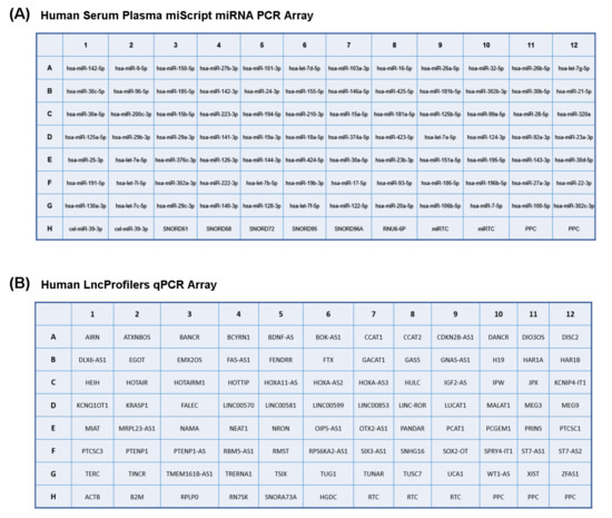 (A) plate layout for Human Serum & Plasma miScript PCR Array. Cel-miR-39-3p are spike-in controls SNORD61, SNORD68, SNORD72, SNORD95, SNORD96A, RNU6-6P; housekeeping genes miRTC are controls for retrotranscription, PPC positive controls for PCR. (B): Plate layout for Human LncProfilers qPCR Array. Endogenous reference RNAs for the normalization: ACTB, B2M, RPLP0, RN7SK, SNORA37A, as well as control for human genomic DNA contamination, reverse transcription controls, and positive PCR controls.