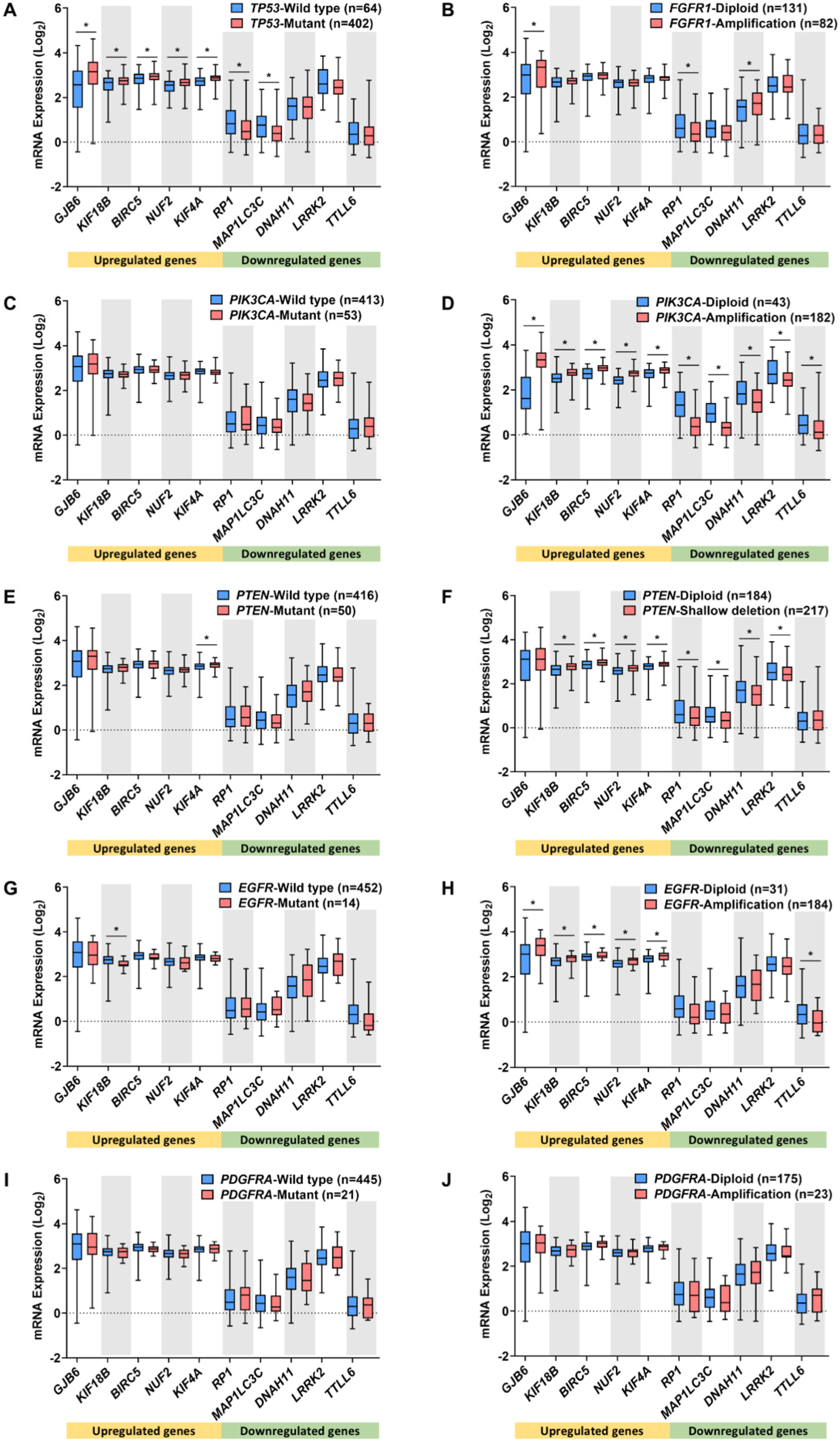 2.2. Association between DEMG Expressions and Lung Cancer Hallmark Gene Alterations