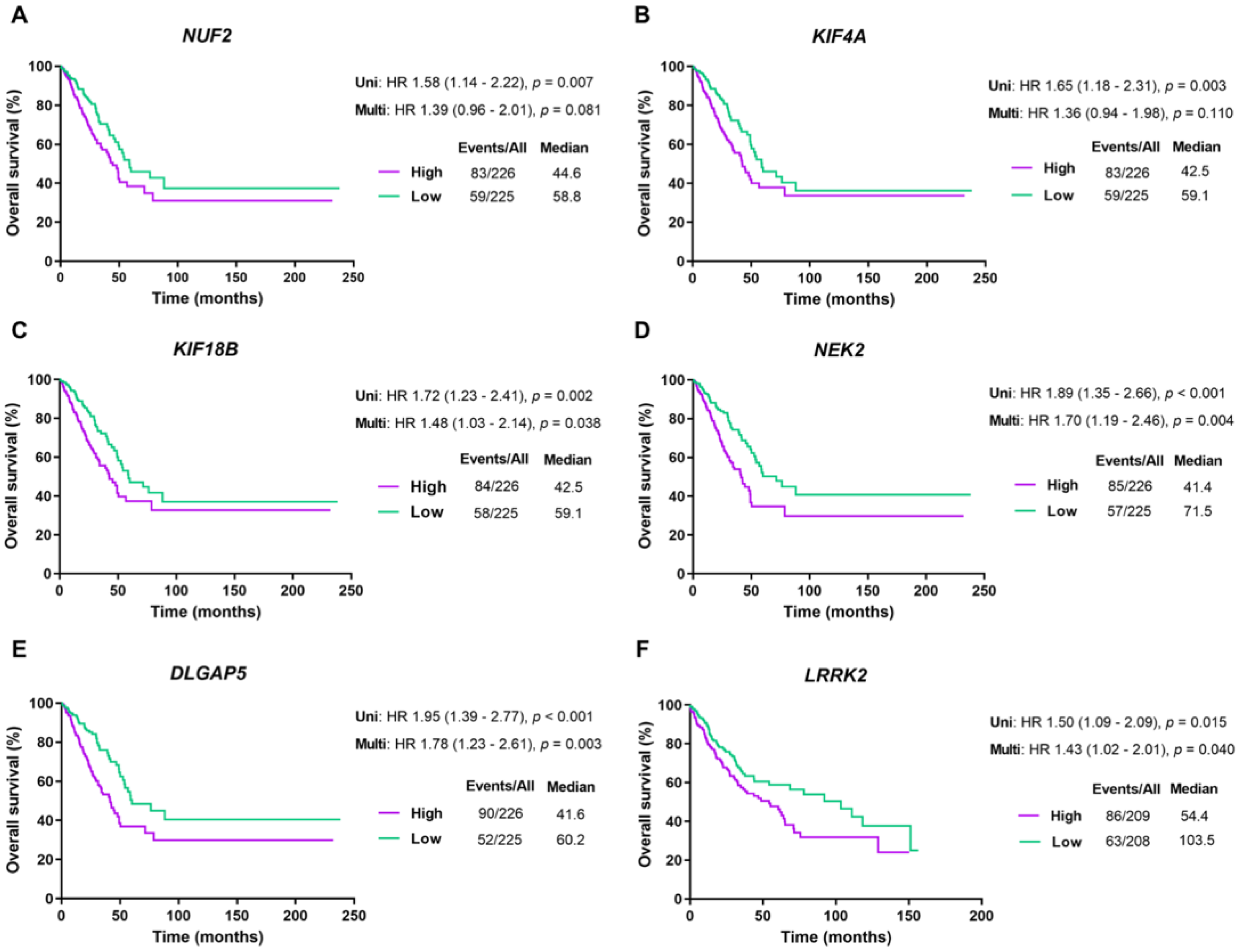- Jiang, X.; Jiang, Y.; Luo, S.; Sekar, K.; Koh, C.K.T.; Deivasigamani, A.; Dong, Q.; Zhang, N.; Li, S.; Hao, F.; et al. Correlation of NUF2 Overexpression with Poorer Patient Survival in Multiple Cancers. Cancer Res. Treat. 2021, 53, 944–961. [Google Scholar] [CrossRef] [PubMed]