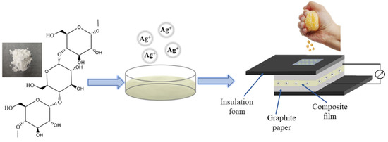 Based on the above problems, we have prepared a composite functional film with a starch solution as the matrix, glycerol as the plasticizer and AgNO3 solution as the additive; this film responds sensitively to the pH value of fruit juice with the fast feedback of electrical signals (Figure 1). The mechanical properties, stability, hydrophilicity and pH response index of the composite films are analyzed and measured. Based on the above modern analytical techniques, we compare the effects of corn starch (CS) and amylopectin (CA) on the composite films and discuss the trends of the effects of ionic addition on the functionality of the composite films. The composite films respond sensitively to the pH value of the juice. This study provides a new method for the rapid, sensitive and nondestructive monitoring of the quality of liquid food, which has great application prospects in the field of rapid, nondestructive, and real-time digital monitoring of food quality.