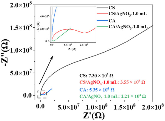 Figure 7 shows the electrochemical impedance spectroscopy (EIS) of the pure starch film and the starch/AgNO3-1.0 mL composite films. The EIS diagram features a semicircle in the high-frequency region and a straight line in the medium-to-low-frequency regions (Figure 7). The semicircular arc in the high-frequency region is the charge transfer impedance (Rc) caused by the gain and loss of electrons, while the straight line in the medium and low frequency regions is related to the solid diffusion process. The smaller the diameter of the semicircular arc of the impedance curve is, the faster the charge transfer rate and the lower the electron transfer resistance will be [35]. According to the EIS, after circuit fitting, the doping of the AgNO3 solution reduces the resistance of the composite films and enhances their electrical conductivity. The addition of the AgNO3 solution enhances the electrical conductivity of the film, probably due to the formation of ionic hydrates in the composite film, decreasing the resistance value of the composite film. By comparing the CS and CA films, the resistance value of the CS film is determined to be greater than that of the CA film under the same test conditions. According to the EIS and XRD analyses, this phenomenon may be caused by the amylose in the CS film, which is associated with the linking of the starch molecule between the chains, making the film-forming structure tighter and resulting in its poor electrical conductivity.