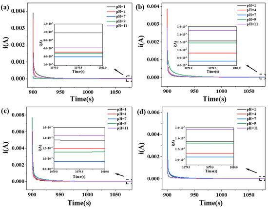 Steady current at different pH value of (a) pure CS film, (b) CS/AgNO3-1.0 mL composite film, (c) pure CA film and (d) CA/AgNO3-1.0 mL composite film.