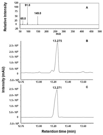 The peak of enzymolysis product of the purified GLS was located at m/z 91 detected by GC MS, which corresponded to [M-NCS]+ (Figure 2A). The retention time of enzymolysis product and BITC was 13.275 min and 13.271 min, respectively (Figure 2B,C). By comparison of retention time, m/z, and result in NIST standard library, this enzymolysis product was determined to be BITC.