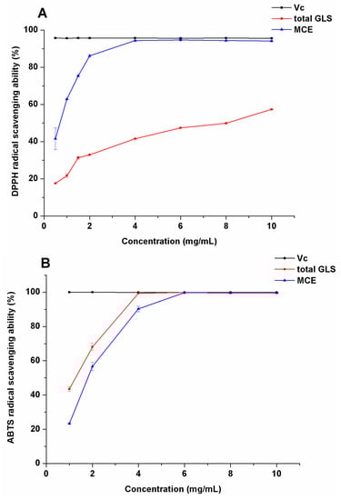 ABTS radical scavenging assay: ABTS radical scavenging assay of total GLS and MCE was performed according to the method of Wang W. et al. with slight improvement []. A 2.45 mmol/L K2S2O8 solution and a 7 mmol/L ABTS radical solution were mixed and the mixture was stood overnight. The mixture was diluted with ethanol until the absorbance was about 0.70 ± 0.02 at 752 nm. Then, 0.5 mL of samples with different concentrations were mixed with 3.00 mL of diluted ABTS free radical stock solution. The above sample stood for 15 min. Using ethanol as blank, the absorbance of sample was measured at 752 nm. VC with the same concentration was used as the positive control. ABTS radical scavenging activity was calculated according to the following Equation (3).