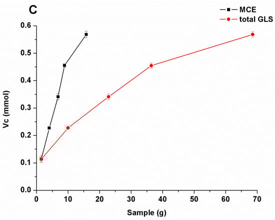 Detection of reducing power: The determination of reducing power is a common method to evaluate the antioxidant activity of samples. In this experiment, the reducing power of sample was measured with reference to the method reported by Wang C.C. et al. []. In Figure 3C, reducing power of 0.227 mmol Vc was equivalent to that of 4.03 g MCE or 9.99 g total GLS. Hence, reducing power of MCE is higher than that of total GLS. This result of the low antioxidant activity of total GLS is in agreement with a previous finding that GLS showed no evidence for chemical defense signaling in Brassica rapa [].