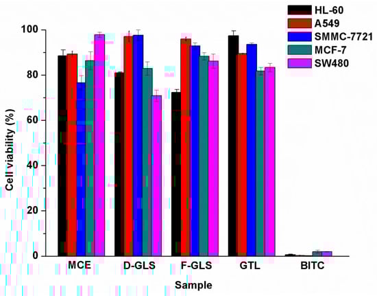 Some references reported that anti-cancer activity of Maca was related to GLS, while others reported that it related to GLS and their enzymolysis products [,]. To elucidate this problem, we selected GLS extracted from fresh Maca (F-GLS) and dried Maca (D-GLS), MCE, GTL, and BITC as samples to evaluate their cytotoxicity in vitro on five human cancer cells including leukemia HL-60, lung cancer A549, liver cancer SMMC-7721, breast cancer MCF-7, and colon cancer SW480 in this assay. As seen in Figure 4, there was much difference in the inhibitory activities among F-GLS, D-GLS, MCE, and GTL on the five tumor cell lines. Cytotoxicities of F-GLS, D-GLS, MCE, and GTL on these five human cancer cells were less than 50%, and thus considered to have no anti-cancer activity.
