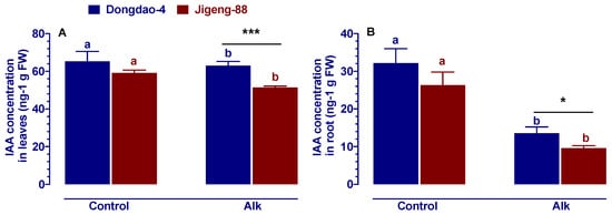 IAA concentrations of (A) shoots and (B) roots of Dongdao-4 and Jigeng-88 seedlings grown in control and alkaline stress medium. Two-week-old rice seedlings cultivated in normal culture solution were moved to culture solution that was added with 20 mM NaHCO3 and had a pH of 8.5 for 5 days. Alk = alkaline stress. Bars = 10 cm. Data are means ± SE (n ≥ 5). Means with different letters are significantly different between control and alkaline stress of the same genotype (p < 0.05). Asterisks indicate significant differences within the same treatment (* p < 0.05, *** p < 0.001).