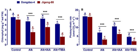 Effects of IAA and TIBA on (A) foliar chlorophyll concentration and (B) photosynthetic rates of Dongdao-4 and Jigeng-88 seedlings after treatment with alkaline stress. Treatments were as described in Figure 1. Means with different letters are significantly different (p < 0.05) between control and “Alk” and “Alk + IAA” and “Alk + TIBA” of the same genotype. Asterisks indicate significant differences between different genotypes within the same treatment (*** p < 0.001).