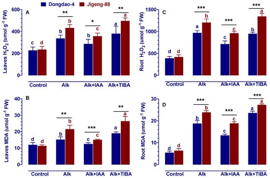 Effects of IAA and TIBA on contents of (A,C) H2O2, (B,D) malondialdehyde (MDA) of Dongdao-4 and Jigeng-88 seedlings after treatment with alkaline stress. Treatments were as described in Figure 1. Means with different letters are significantly different (p < 0.05) between control and “Alk” and “Alk + IAA” and “Alk + TIBA” of the same genotype. Asterisks indicate significant differences between different genotypes within the same treatment (* p < 0.05, ** p < 0.01, *** p < 0.001).
