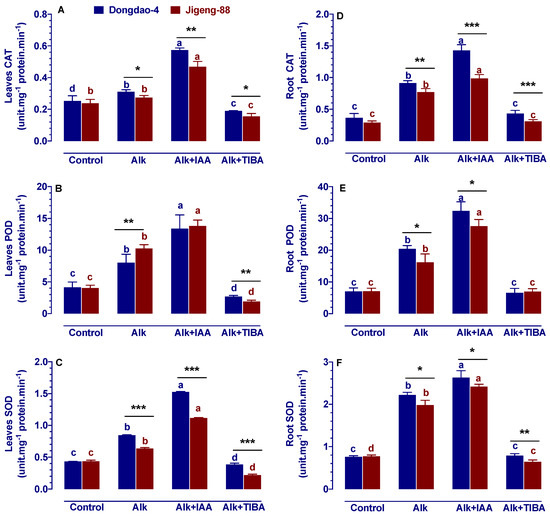 Effects of IAA and TIBA on antioxidant enzymes in shoots/roots of Dongdao-4 and Jigeng-88 seedlings after treatment with alkaline stress. (A,D) Catalase (CAT) in leaves/roots. (B,E) Peroxidase (POD) in leaves/roots. (C,F) Superoxide dismutase (SOD) leaves/roots. Treatments were as described in Figure 1. Means with different letters are significantly different (p < 0.05) between control and “Alk” and “Alk + IAA” and “Alk + TIBA” of the same genotype. Asterisks indicate significant differences between different genotypes within the same treatment (* p < 0.05, ** p < 0.01, *** p < 0.001).