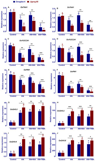 Effects of alkaline stress on the expression of genes involved in IAA biosynthesis (OsTAA1 and OsYUCCA1), transport (OsPIN1) and catabolism (OsGH3.2 and OsGH3.8) in shoots (A,C,E,G,I) and roots (B,D,F,H,J) of Dongdao-4 and Jigeng-88 seedlings. Treatments were as described in Figure 1. Means with different letters are significantly different (p < 0.05) between control and “Alk” and “Alk + IAA” and “Alk + TIBA” of the same genotype. Asterisks indicate significant differences between different genotypes within the same treatment (* p < 0.05, ** p < 0.01, *** p < 0.001).