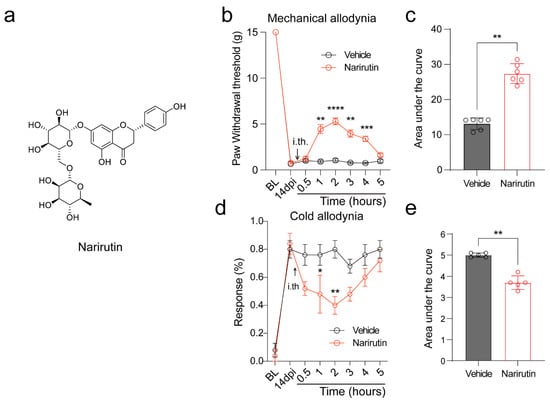 Narirutin (C27H32O14, PubChem CID 442431, molecular weight 580.5 g/mol; Figure 1a) is a flavonoid with reported antioxidative and anti-inflammatory actions []. As a disaccharide derivative of naringenin, whether Narirutin has the same analgesic effect as naringenin [] has not been confirmed. Here, we set out to evaluate its analgesic effect and investigate its possible mechanism of action. To assess Narirutin’s potential antinociceptive activity, we selected the SNI neuropathic pain model. The model involves a lesion of two of the three terminal branches of the sciatic nerve (tibial and common peroneal nerves), keeping the sural nerve intact, and could result in early and prolonged peripheral neuropathic pain []. Six adult male rats were subjected to SNI surgery (see Methods), and the paw withdrawal threshold was measured 14 days post-injury (dpi). In this allodynic state, the rats were intrathecally treated with vehicle (10% DMSO, 10% Tween-80, 80% Saline, 20 μL) or Narirutin (20 μg/20 μL). Paw withdrawal thresholds in SNI rats treated with Narirutin were significantly increased at 1 h post-treatment, lasting for about 3 h (Figure 1b). An increased area under the curve supported these data as a result of treatment with Narirutin compared to vehicle rats (Figure 1c). Moreover, we also performed acetone test to evaluate Narirutin’s antinociceptive capacity on cold allodynia. After treatment with Narirutin, cold allodynia was significantly decreased (Figure 1d,e). Together, these data demonstrate the antinociceptive potential of Narirutin in nerve injury-induced neuropathic states.