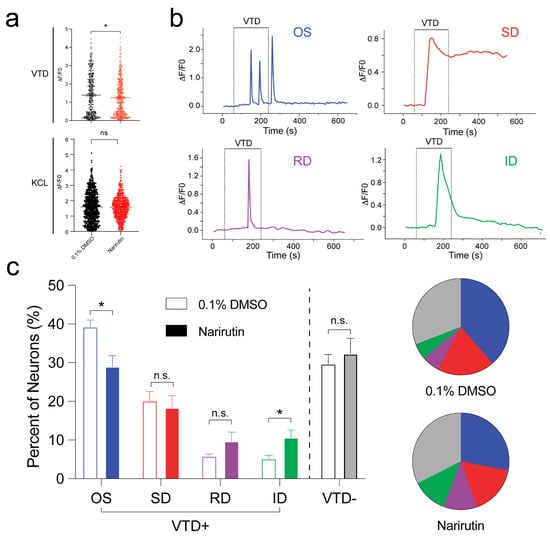 The effects of analgesics on nociceptors and non-nociceptors are different. People seek ideal analgesics that have a specific effect on nociceptors, with minimal or no effect on non-nociceptors (as a proxy for unwanted adverse effects on CNS and motor neurons). To achieve this goal, Mohammed and colleagues developed a simultaneous assessment of drugs’ action on nociceptors and non-nociceptors based on neurons’ distinct response profiles to VTD. They, therefore, provided an efficient and more informative assay for screening for analgesics on sensory neurons []. Generally, VTD elicits four distinct response profiles in different sensory neurons: oscillatory (OS), slow decay (SD), rapid decay (RD), and intermediate decay (ID). OS stands for nociceptors, while most non-nociceptors showed SD. Changes in the OS population reflect changes in nociceptors. Changes in the VTD-irresponsive population (VTD-) can reflect the sensitization of high-threshold and usually “silent” neurons. The two minor profiles, ID and RD, are mostly nociceptors but can be excluded from an assay for simplicity as both account for less than 5% to 10% of all neurons. In this study, we conducted a calcium imaging assay according to the above protocol to evaluate the effect of Narirutin on different types of neurons. First, we evaluated the peak calcium responses of DRG neurons induced by VTD after Narirutin incubation. As a result, Narirutin inhibits VTD-triggered Ca2+ activities in DRG neurons. Then, after dividing these neurons into four classes, we identified Narirutin as an ideal analgesic based on its ability to reduce the OS population without affecting the SD and VTD-populations.