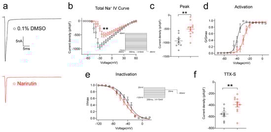 Narirutin reduces the total Na+ currents in DRG sensory neurons. (a) Representative traces of the total Na+ currents from DRG sensory neurons treated with 0.1% DMSO (control) or 20 µM Narirutin. Currents were evoked by 200 ms pulse between −70 and +60 mV. Summary of (b) the normalized (pA/pF) sodium current density versus voltage relationship and (c) peak total Na+ current density at −10 mV from DRG neurons treated as indicated. Boltzmann fits for normalized conductance, G/Gmax voltage relationships for voltage-dependent (d) activation, and (e) inactivation sensory neurons. The half-maximal activation (V1/2) and slope values (k) for activation and inactivation are summarized in Table 1. (f) Summary of peak TTX sensitivity (TTX-S) Na+ current densities for DRG neurons treated as described above. The TTX sensitivity fractions were calculated as described in the Methods section. Data are expressed as means ± SEM. Asterisks indicate statistical significance compared with vehicle treatment (** p < 0.01, Mann–Whitney test, n > 9 cells per condition).