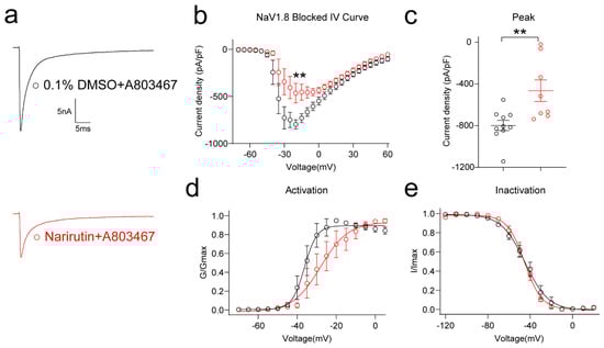 The Nav1.8 channel is one of the TTX-R channels highly correlated with nociceptive signal transmission [,]. To corroborate the above findings pharmacologically, we used the specific Nav1.8 inhibitor A-803467. DRG neurons were cotreated with 500 nM A-803467 acutely after overnight 0.1% DMSO or 20 μM Narirutin administration. After excluding Nav1.8 by A-803467, Narirutin can still significantly inhibit the rest of the NaV subtype channels with a 41.72% decrease in peak current density (Figure 5b,c, 0.1% DMSO, −798.1 ± 49.1 pA/pF (n = 10); Narirutin, −465.2 ± 103.5 pA/pF (n = 8), p = 0.0044; Mann–Whitney test) as well as a right shift of the activation properties (Figure 5d,e, Table 1). These results show that Narirutin specifically inhibits TTX-S rather than TTX-R Na+ currents.