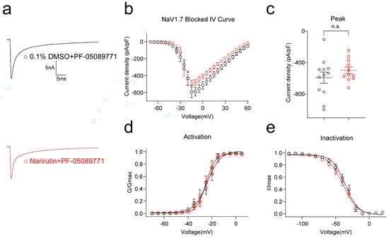 Since Narirutin can inhibit TTX-S rather than TTX-R sodium currents, we wondered if it can specifically target a single subtype of TTX-S Na+ channel. In DRG neurons, TTX-S currents are fast-inactivating, primarily carried by Nav1.1, 1.3, 1.6, and 1.7 in DRG, and shape the action potential and consequent requirement for initial depolarization. Among these subtype channels, Nav1.7 functions as a threshold channel to generate and propagate action potentials and modulate neuron excitability []. Therefore, we used a specific Nav1.7 inhibitor, PF-05089771, to clarify if Narirutin can specifically target on the Nav1.7 channel. DRG neurons were cotreated with 100 nM PF-05089771 acutely after incubating 0.1% DMSO or 20 μM Narirutin overnight. In DRG neurons treated with both compounds, the inhibition effect of Narirutin on total sodium current is blunted by PF-05089771 in DRG sensory neurons (Figure 6b,c, 0.1% DMSO, −590.1 ± 71.2 pA/pF (n = 12); Narirutin, −497.7 ± 43.0 pA/pF (n = 11), p = 0.5254; Mann–Whitney test). Activation properties between the two groups show no significant difference (Figure 6e,f, Table 1).