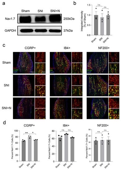 Since Narirutin can selectively inhibit Nav1.7 channels, we hypothesized that in addition to direct inhibiting, Narirutin might affect the expression level of Nav1.7 on DRG nociceptive neurons. To confirm this hypothesis, we investigated the effect of Narirutin on Nav1.7 expression in L4-L6 DRGs of SNI rats. However, Western Blotting did not show any profound alterations in the total protein expression of Nav1.7 among three groups of DRGs: sham, SNI, and SNI treated with Narirutin (Figure 8a,b). As the calcium imaging data indicate that Narirutin mainly affects nociception neurons, we then co-immunostained Nav1.7 with CGRP, IB4, and NF200 separately to identify the effects of Narirutin on the expression level of Nav1.7 on different types of neurons. Interestingly, we found that the percentage of Nav1.7-positive cells in CGRP-labeled neurons is increased, and such increment can be blunted by Narirutin administration (Figure 8c,d). However, such an effect cannot be found in IB4- or NF200-labeled neurons. These results indicate that Narirutin could downregulate the expression of Nav1.7 on CGRP+ DRG nociceptive neurons.