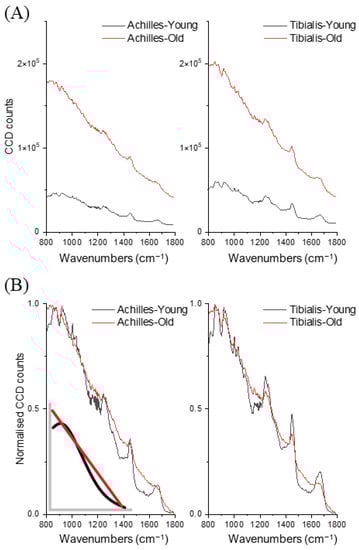 In Raman spectroscopy, a highly fluorescent background in biological tissues is seen as interference and is usually removed at the first stage in the data analysis (e.g., by polynomial subtraction) []. We have developed a step-by-step analysis for tendon measurements that includes both combined spectra and fluorescence-removed Raman spectra for better differentiating age-related spectral differences, as described previously [].
