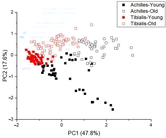 After fluorescence background removal, the underlying Raman spectra were pooled and underwent principal component analysis (PCA). The Achilles tendon and tibialis anterior tendon were separated primarily along the maximal variance axis (47.8% of variance), PC1, while the different age groups were separated along the PC2 axis (17.6% of variance), see Figure 2.