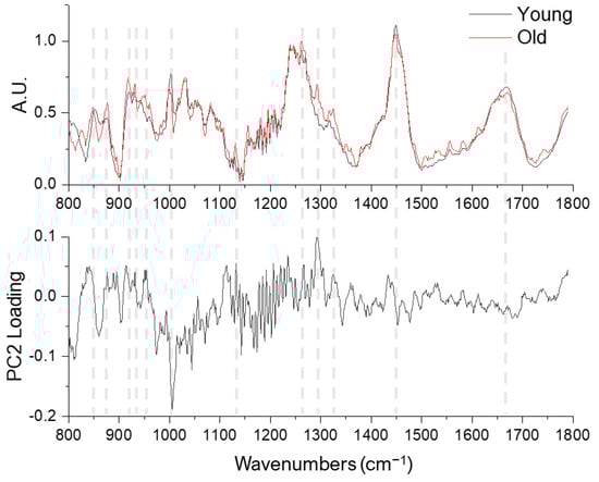 Averaged Raman spectra of young (n = 80, black lines) and old (n = 80, red lines) tendons (upper row) and the PC2 loading (lower row).