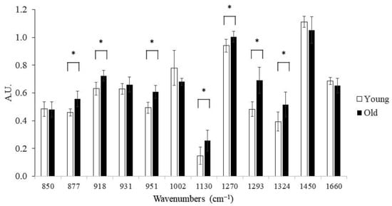 Group comparison between different Raman band intensities. Young group: n = 8 specimens, 10 spectra per specimen; Old group: n = 8 specimens, 10 spectra per specimen; *: p < 0.05.