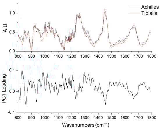 The compositional differences identified by Raman spectroscopy between the Achilles and tibialis anterior tendons allow separation by the PC1 loading. It has been reported that the human Achilles tendon has higher glycosaminoglycan and DNA content than the tibialis anterior tendon, with a similar total collagen content [,]. Interestingly, our previous study [] demonstrated the most evident spectral differences between the equine SDFT and deep digital flexor tendon (DDFT) were present in the proline/hydroxyproline region (800–1000 cm−1) and CH2 bending band, without significant difference in amide I band []. Future comparison of tendons from different species should be made with caution since the vibrational mode of the specific tendon composition are yet unclear and often difficult to study in isolation.