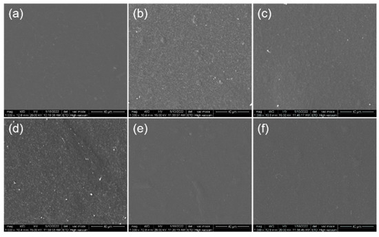SEM images of pure CNFs and different composite films. (a) CNF; (b) CNF/P1; (c) CNF/P2; (d) CNF/P3; (e) CNF/M1; (f) CNF/M2. Magnification: 1000×.
