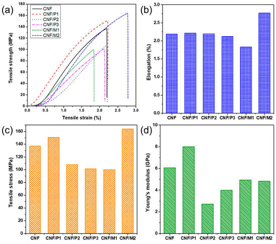 Mechanical properties of pure CNF film and different composite films. (a) Stress–strain curve; (b) Elongation to break; (c) Tensile stress; (d) Young’s modulus.