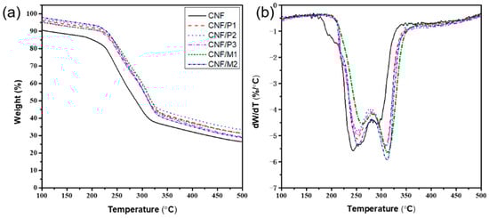 (a) TG and (b) DTG curves of pure CNF film and different composite films.