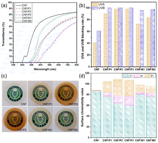 (a) The UV-vis transmission spectra of pure CNF film and different composite films. (b) UVA and UVB blocking rate of pure CNF film and different composite films. (c) Visual photograph of pure CNF film and different composite films. (d) Surface chromaticity value of pure CNF film and different composite films.
