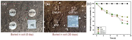 (a,b) The biodegradability test under moist soil for pure CNF, CNF/P1, CNF/M1, and PE films. (c) Effect of seawater immersion time on the weight remaining of pure CNF, CNF/P1, CNF/M1, and PE films.