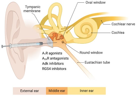 - Chang, H.; Telang, R.S.; Sreebhavan, S.; Tingle, M.; Thorne, P.R.; Vlajkovic, S.M. Pharmacokinetic Properties of Adenosine Amine Congener in Cochlear Perilymph after Systemic Administration. BioMed Res. Int. 2017, 2017, 8091462. [Google Scholar] [CrossRef]