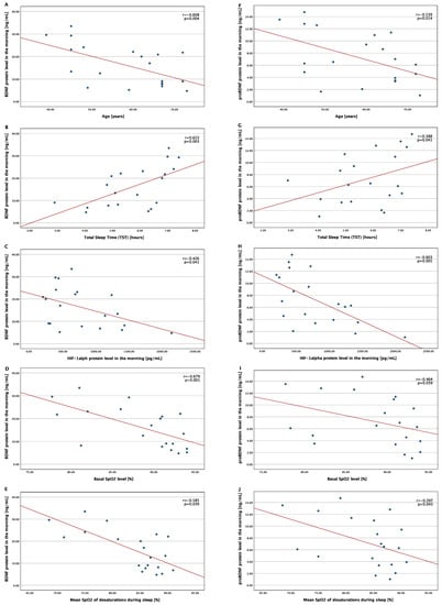 Correlation between morning BDNF and proBDNF protein levels and the chosen variables in the OSA group. Abbreviations: BDNF—brain-derived neurotrophic factor, HIF-1—hypoxia-inducible factor 1, OSA—obstructive sleep apnea, SpO2—oxygen saturation. (A) Correlation between the BDNF protein level in the morning and age; (B) correlation between the BDNF protein level in the morning and total sleep time (TST); (C) correlation between the BDNF protein level in the morning and HIF-1 alpha protein level in the morning; (D) correlation between the BDNF protein level in the morning and Basal SpO2 level; (E) correlation between the BDNF protein level in the morning and mean SpO2 of desaturations during sleep; (F) correlation between the proBDNF protein level in the morning and age; (G) correlation between the proBDNF protein level in the morning and total sleep time (TST); (H) correlation between the proBDNF protein level in the morning and HIF-1 alpha protein level in the morning; (I) correlation between the proBDNF protein level in the morning and Basal SpO2 level; (J) correlation between the proBDNF protein level in the morning and mean SpO2 of desaturations during sleep.