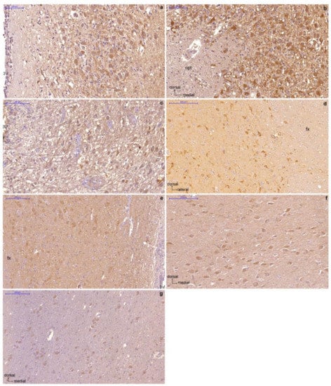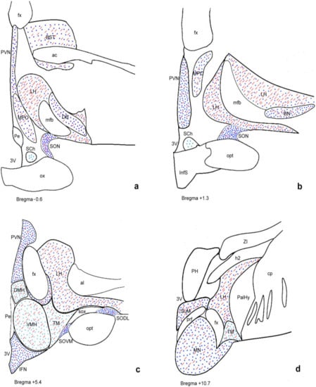 - Swaab, D.F. Part I: Nuclei of the human hypothalamus: Cytoarchitecture, chemoarchitecture, functional neuroanatomy, topographic neuropathology. In Handbook of Clinical Neurology. The Human Hypothalamus: Basic and Clinical Aspects; Aminoff, M.J., Boller, F., Swaab, D.F., Eds.; Elsevier: Amsterdam, The Netherlands, 2003; Volume 79, pp. 3–59. [Google Scholar]