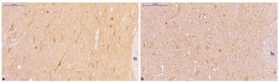 Consecutive 4 μm coronal sections of hypothalamus (preoptic area, anterior hypothalamic area, tuberal region, and mammillary region) were analyzed. Three to six hypothalamic sections per nucleus per case taken at regular intervals throughout the rostrocaudal axis of each nucleus were deparaffinized in a series of xylene and ethanol. Immunohistochemistry was performed as previously described [,]. In brief, after blocking endogenous peroxidase activity by incubating the sections in methanol containing 0.3% H2O2 for 20 min and performing antigen retrieval in citrate buffer (pH 6), sections were incubated overnight at 4 °C using a rabbit polyclonal anti-GLP-1R antibody (1:50; Origene, Rockville, MD, USA, TA336864). Specificity of GLP-1R antiserum has been previously described in detail [,,]. Color was developed using the EnVision Flex Kit (Agilent Technologies Inc., Santa Clara, CA, USA) according to the manufacturer’s instructions. Briefly, after incubation with the primary antibody, sections were washed in TBS and incubated with the secondary antibody coupled with activation reagent EnVision Flex horseradish peroxidase (HRP) for 20 min. Visualization was achieved by incubating slides 10 min with 3,3′-diaminobenzidine (DAB). Slides were counterstained with Harris’ hematoxylin, dehydrated in ascending alcohol row, and permanently mounted. All sections were simultaneously processed in the presence of appropriate positive and negative controls.