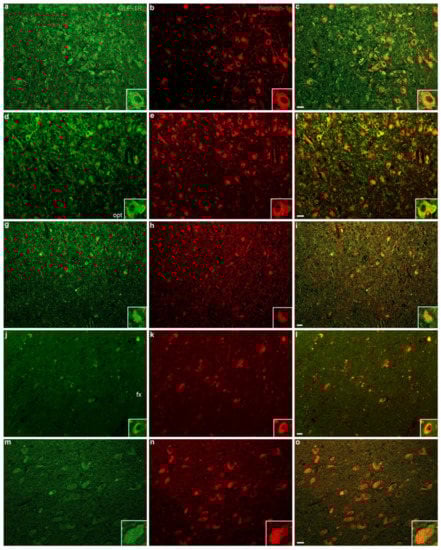 Representative light microscopic fluorescent images depicting GLP-1R and NUCB2/nesfatin-1 colocalization in the human hypothalamus. Representative sections of paraventricular nucleus (a–c), supraoptic nucleus (d–f), infundibular nucleus (g–i), lateral hypothalamic area (g–l), and basal nucleus (m–o) double stained for GLP-1R (green) and NUCB2/nesfatin-1 (red). Merged images depict double stained neurons (c,f,i,l,o) (200×). Insets represent neurons at higher magnification (400×). fx, fornix; opt, optic tract. Scale bars indicate 50 μm.