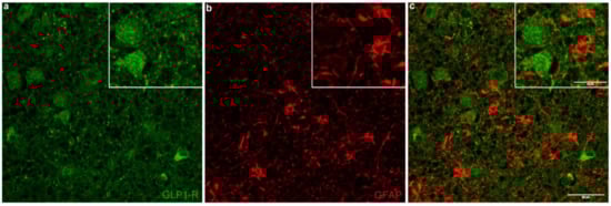 The astrocytes that represent an important central nervous system cell population have been proposed to contribute to the transduction of anorectic GLP-1R-dependent signals in rats []. GLP-1R expression in astrocytes has been described within rat brains [,,] and in a human astrocyte cell line []. On the other hand, no colocalization of GLP-1R with the astrocytic marker glial fibrillary acidic protein (GFAP) was observed in any area of the mouse brain examined, including the hypothalamus [].