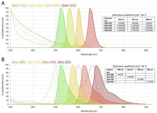 Comparison of spectra of quantum dots and organic dyes for multicolor studies. (A) Spectra of four distinct quantum dots (Qdot). Excitation spectra (dashed lines) are broad and with similar shapes. All the Qdots can be effectively excited using a single wavelength. Emission spectra (solid lines) are narrow, symmetric and quite well separated. (B) Spectra of four distinct organic dyes. Multicolor studies require multiple excitation wavelengths, one for each dye. The typical red tail is visible in the emission spectra, causing a greater overlap than for Qdot spectra. Spectra were produced with FluoroFinder Spectra Viewer [46]. Y-axis reports excitation (or emission) percentage of the excitation (or emission) spectra with respect to their maxima. Tables with extinction coefficients are added by us using data obtained from [282,283].